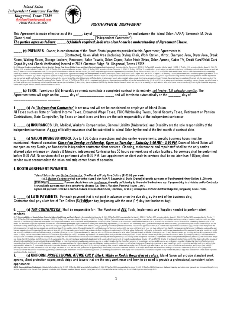 Booth Rental Agreement Island Salon Independent Contractor